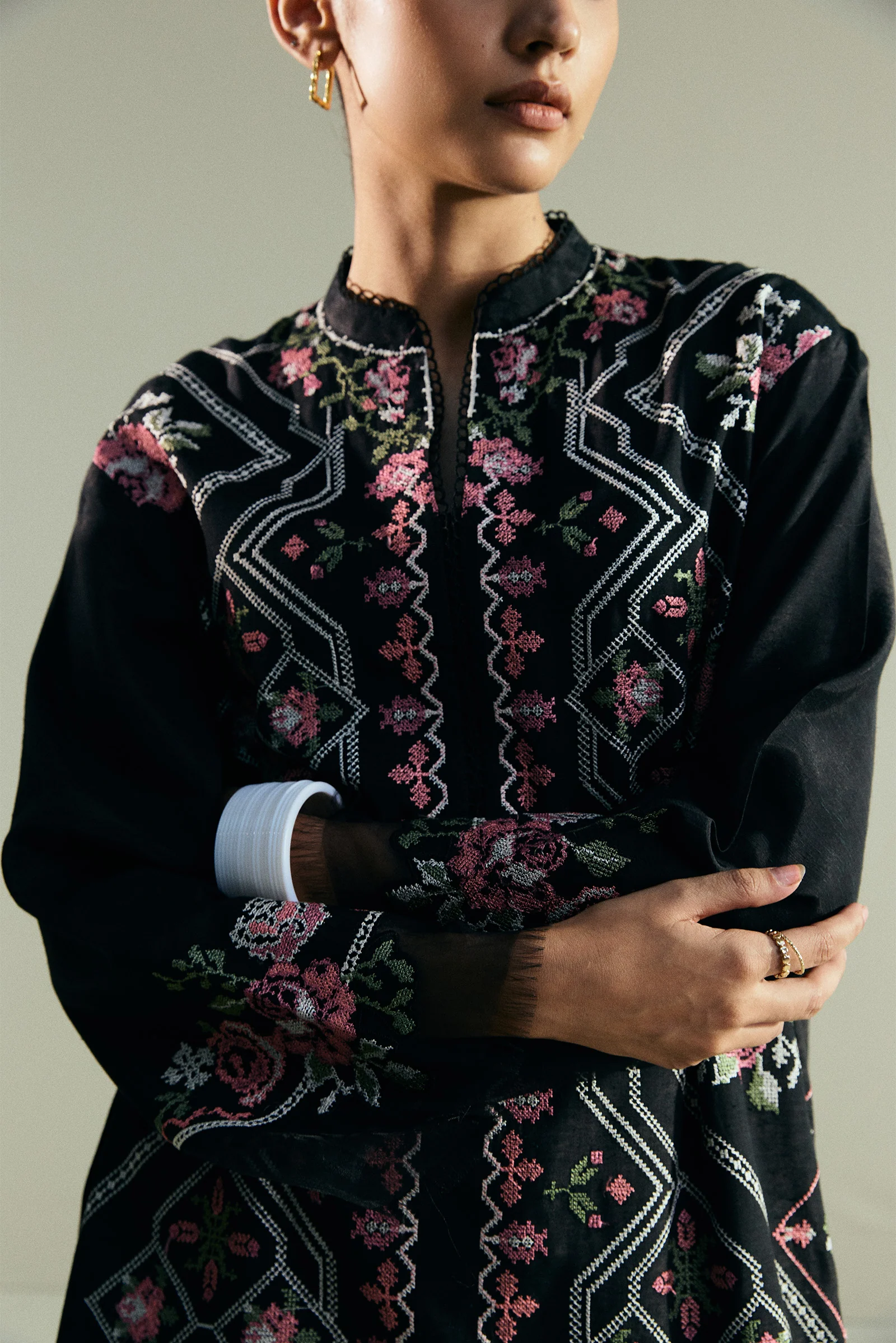 This short black kurta is fully embroidered with vibrant cross-stitch patterns, bringing color and detail to its classic silhouette. It is paired with an embroidered farshi shalwar that adds grace and volume to the look. Together, the pieces create a striking expression of elegance.