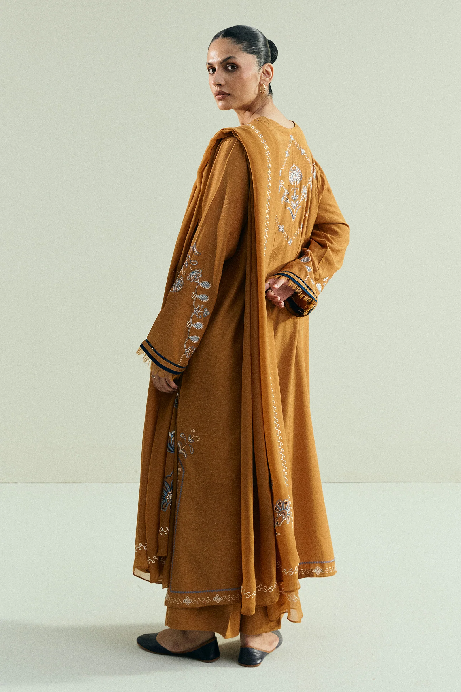 This long mustard loose-fit shirt is styled with minimal embroidery on the front and back, giving it a clean and effortless appeal. It is paired with tonal trousers that keep the silhouette understated. An asymmetrical embroidered dupatta completes the look, adding a touch of contemporary detail.