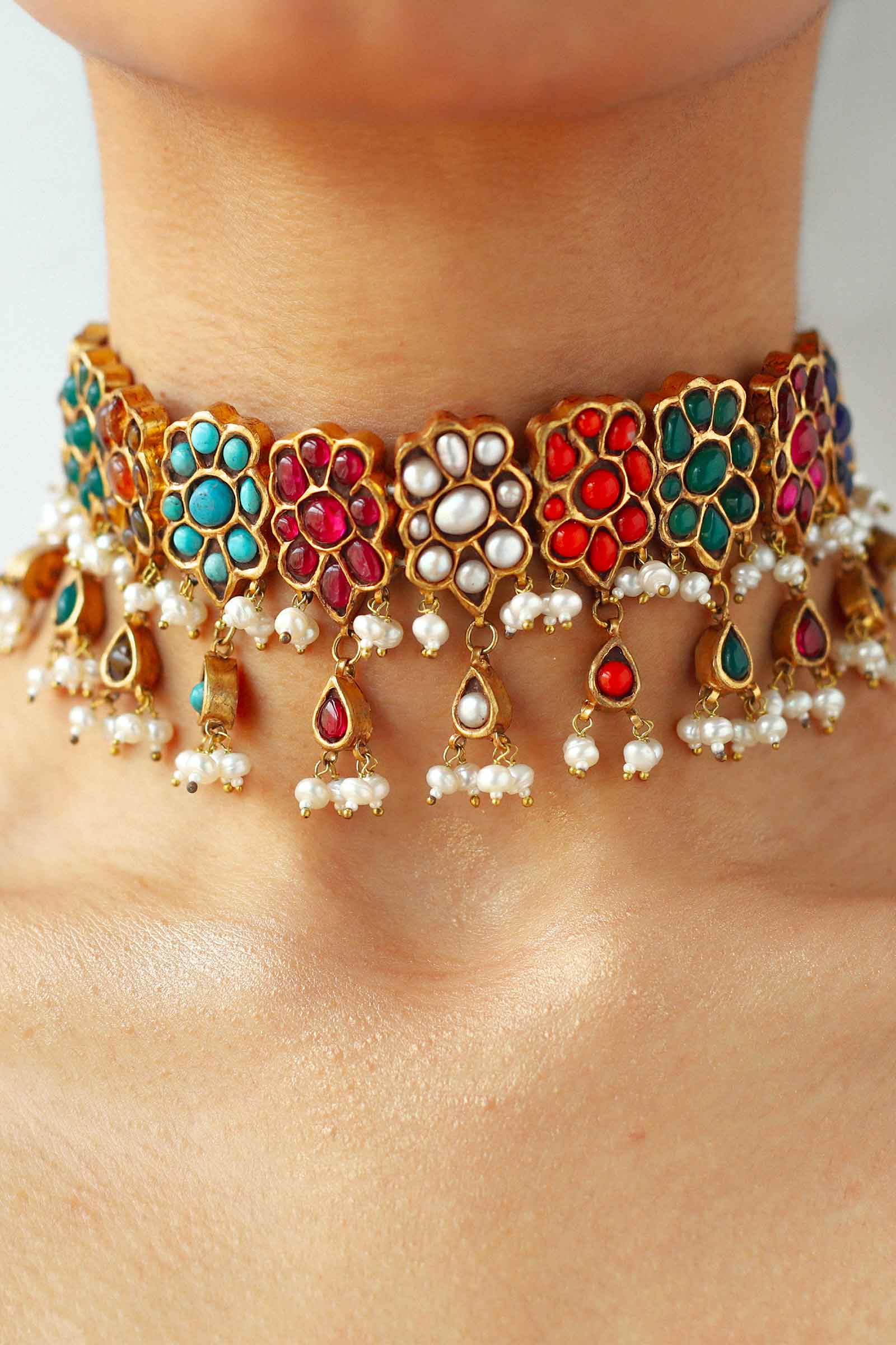 This Necklace is 22k gold plated, set in hand-picked Stone like, Chetam, Sapphire, Nature pearls, Green Agate, Marjan and turquoise. Strung together with natural pearls. Perfect for all your celebrations.