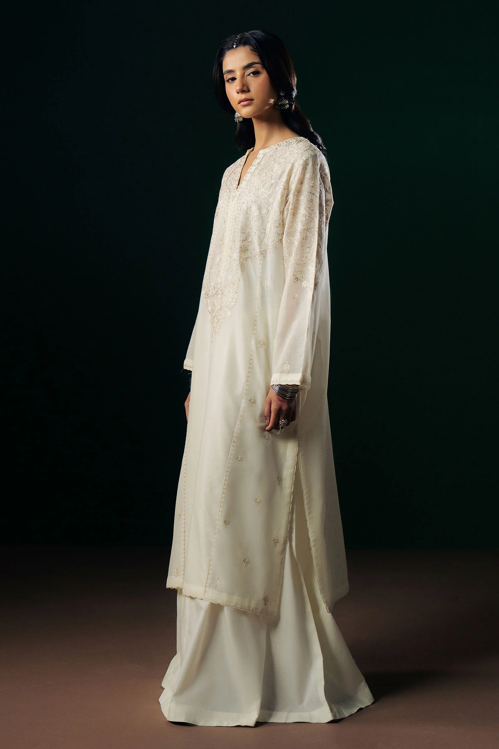 Noorain is a 3-panel long ivory kurta that embodies elegance and timeless sophistication. The soft ivory base is adorned with delicate Kashmiri-style embroidery in beige threads, creating a graceful tonal contrast. The heavily embroidered neckline serves as the focal point, adding richness and visual depth while enhancing the kurta’s overall silhouette.