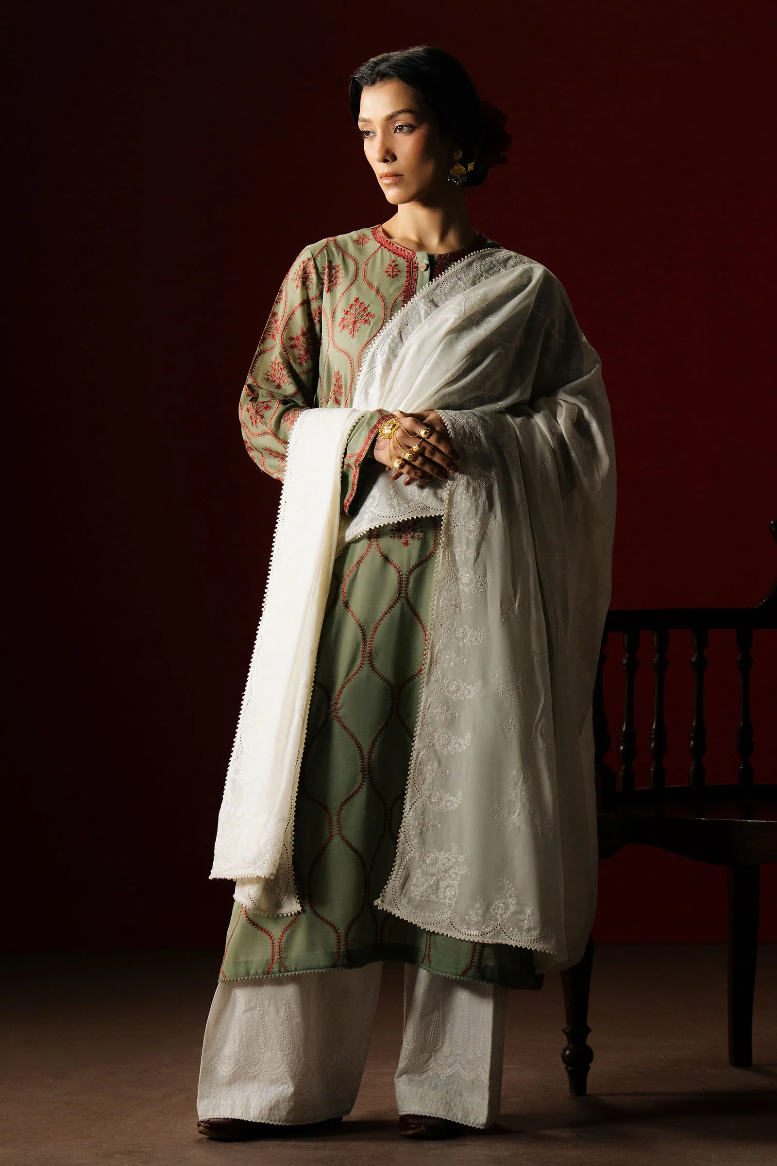 Amanat is an elegant and timeless snow-white dupatta, delicately crafted to celebrate refined Kashmiri artistry. It features a finely composed white-on-white embroidered border, framing the piece with subtle sophistication. The entire fabric is adorned with a delicate jaal embroidery, adding depth, texture, and a gentle play of pattern while preserving a soft, graceful aesthetic.