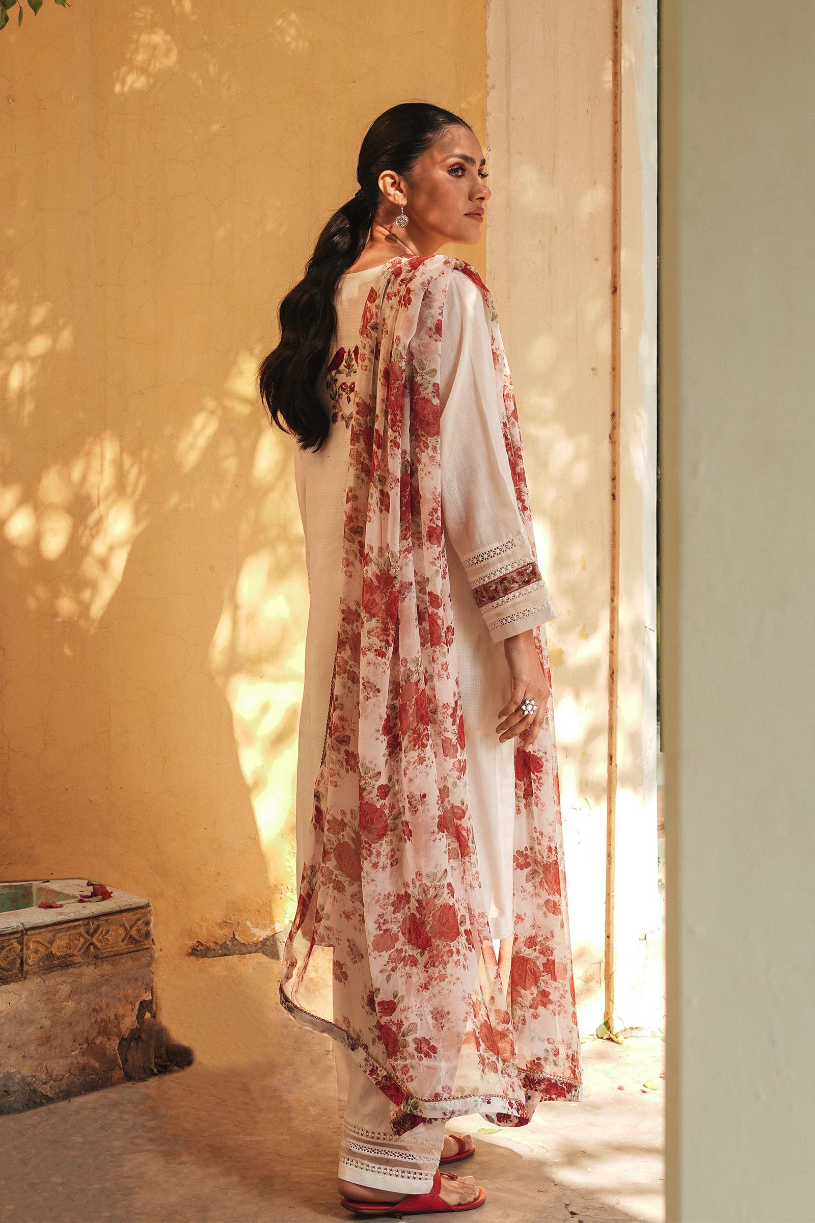 White loose fit kurta with embroidery detail on the back and sleeves, paired with a white shalwar and a white floral dupatta.