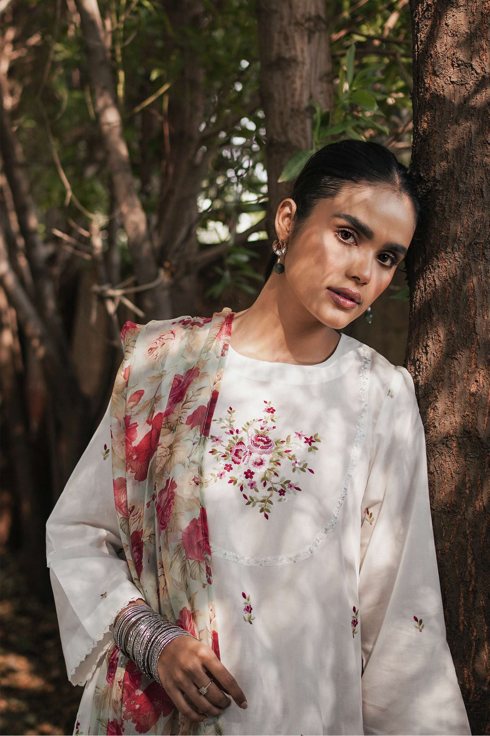 White straight fit kurta with embroidered neckline and boti spray, paired with a floral print culotte and a floral dupatta.