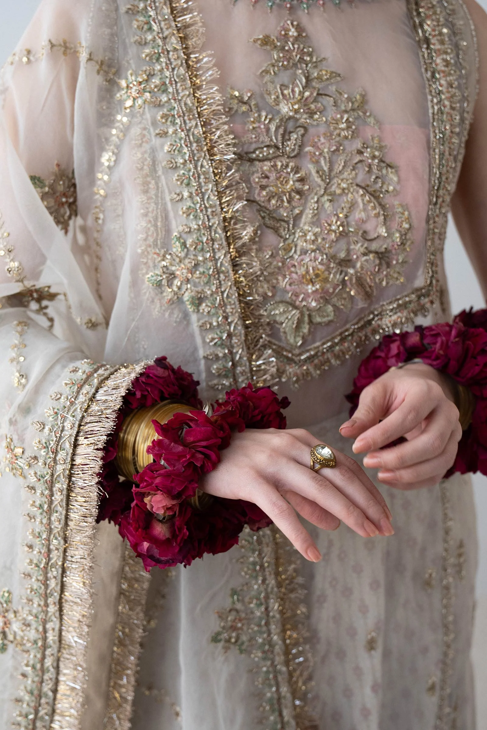 A classic jora for nikkah, fully embellished ivory kurta with heavily embellished neckline and borders. It is paired with a densely embroidered lehenga. The duppata is heavily embroidered and embellished borders adorned with resham, naqshi, sequins and gota and kiran details.