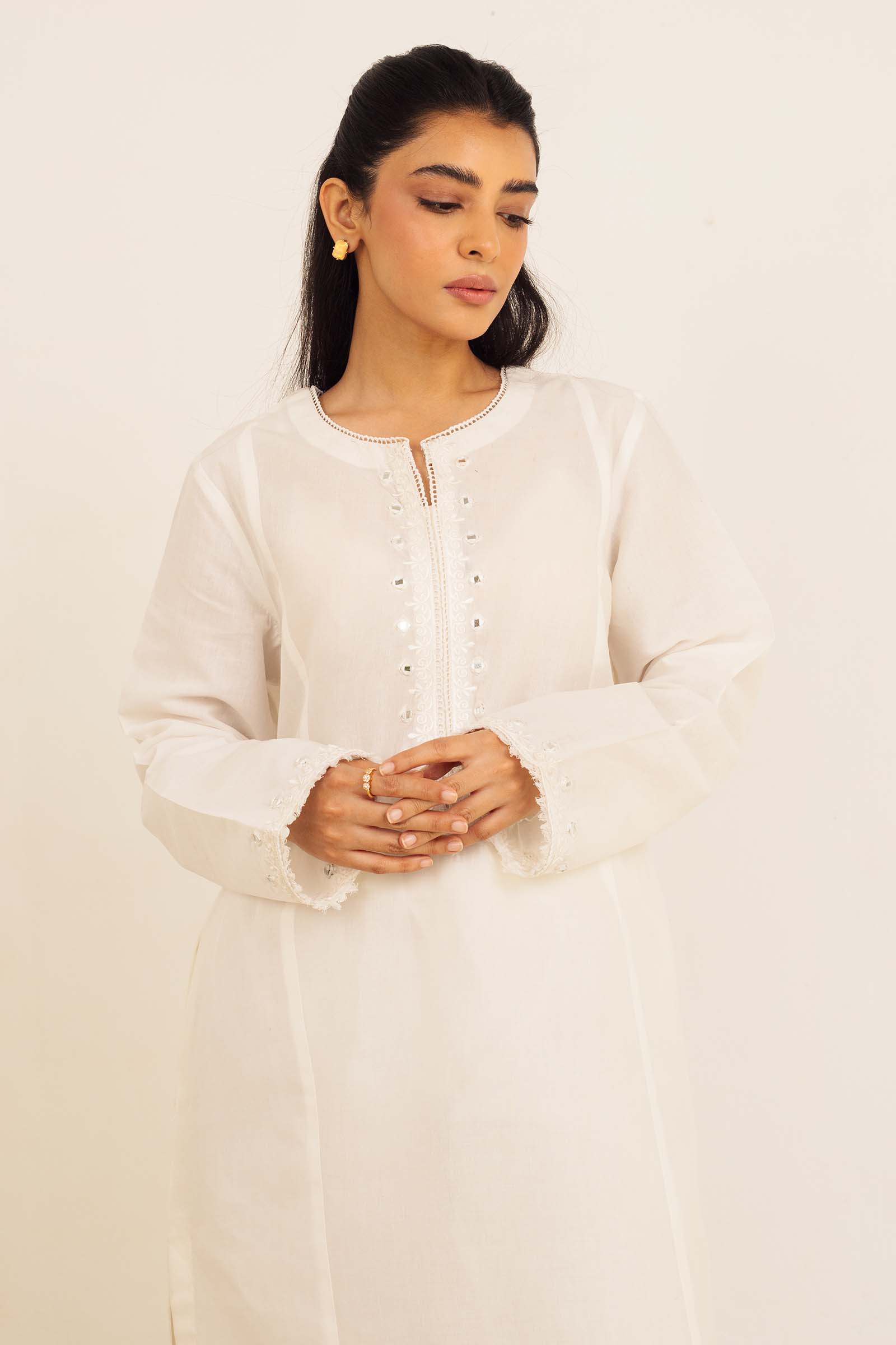A white kurta with embroidery details and mirror work on neckline and sleeves paired with wide-hem pants elevated with mirror work.
