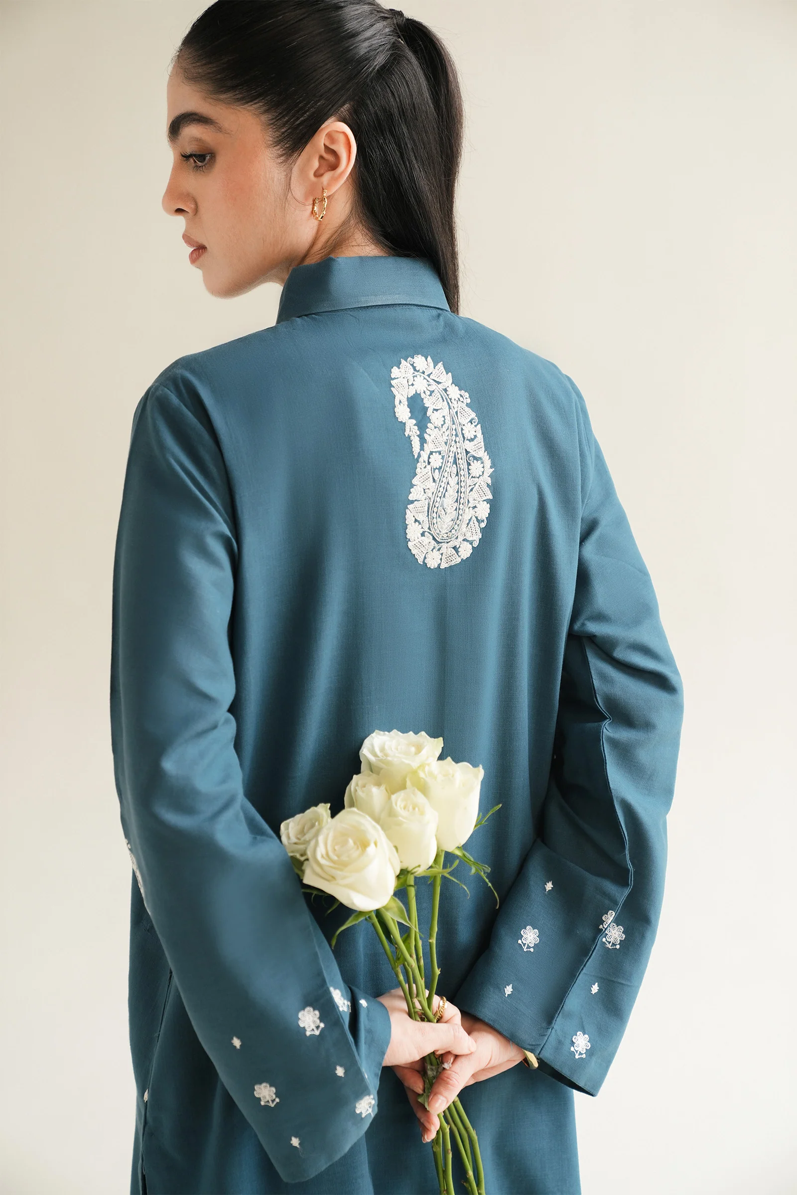 A teal kurta with a clean, timeless silhouette and delicate embroidery, paired with a tapered shalwar in Irish linen.