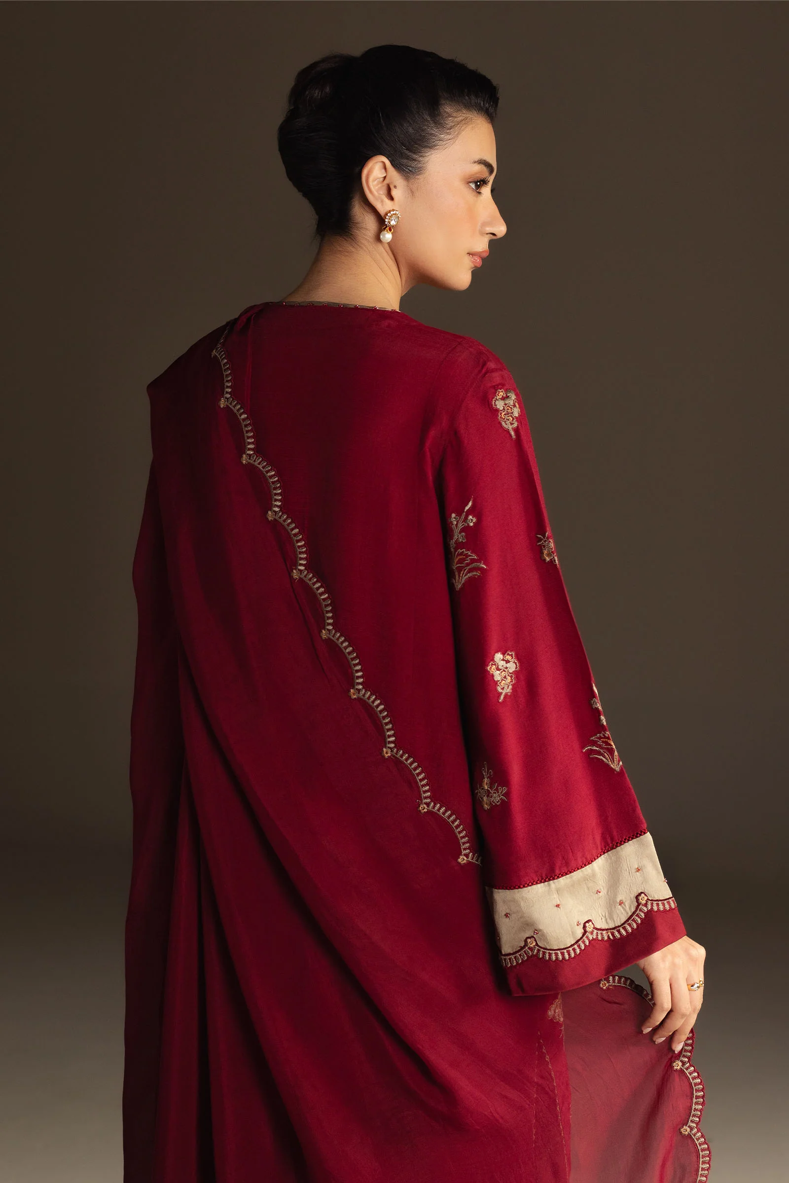 Ayra is a dark burgundy ensemble that exudes quiet sophistication. The shirt showcases intricate embroidery in moss green and beige tones, enhanced with subtle satin finishing that adds a gentle play of texture. Paired with straight-fit pants and a rich silk dupatta edged with scallop detailing, this look is timeless, versatile, and undeniably elegant.