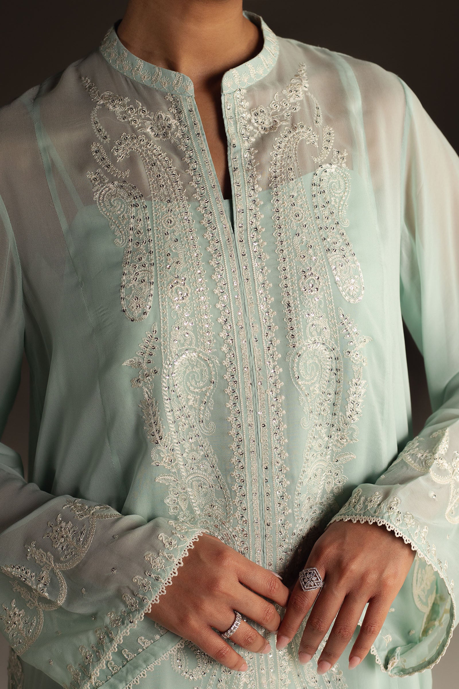 Cool and ethereal, Imaan in ice blue captures classic charm with intricate craftsmanship. The flowing chiffon georgette shirt features signature floral embroidery, paired with simple straight raw silk pants that balance the ornate detailing. Finished with an embroidered georgette dupatta, the ensemble evokes serenity and sophistication in every thread.